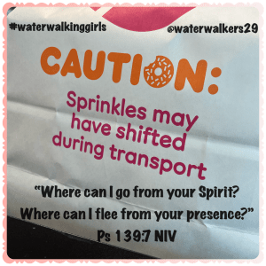 As I was standing at Dunkin Donuts waiting on my order, I read this paper bag here and laughed. Seriously think about our days, especially Monday though Saturday. It is easy for us to get off track, to get away from God. Just like these sprinkles get shifted in transport, we get shifted in life. Thankfully we read in Psalm 139:7; “Where can I go from your Spirit? Where can I flee from your presence?”