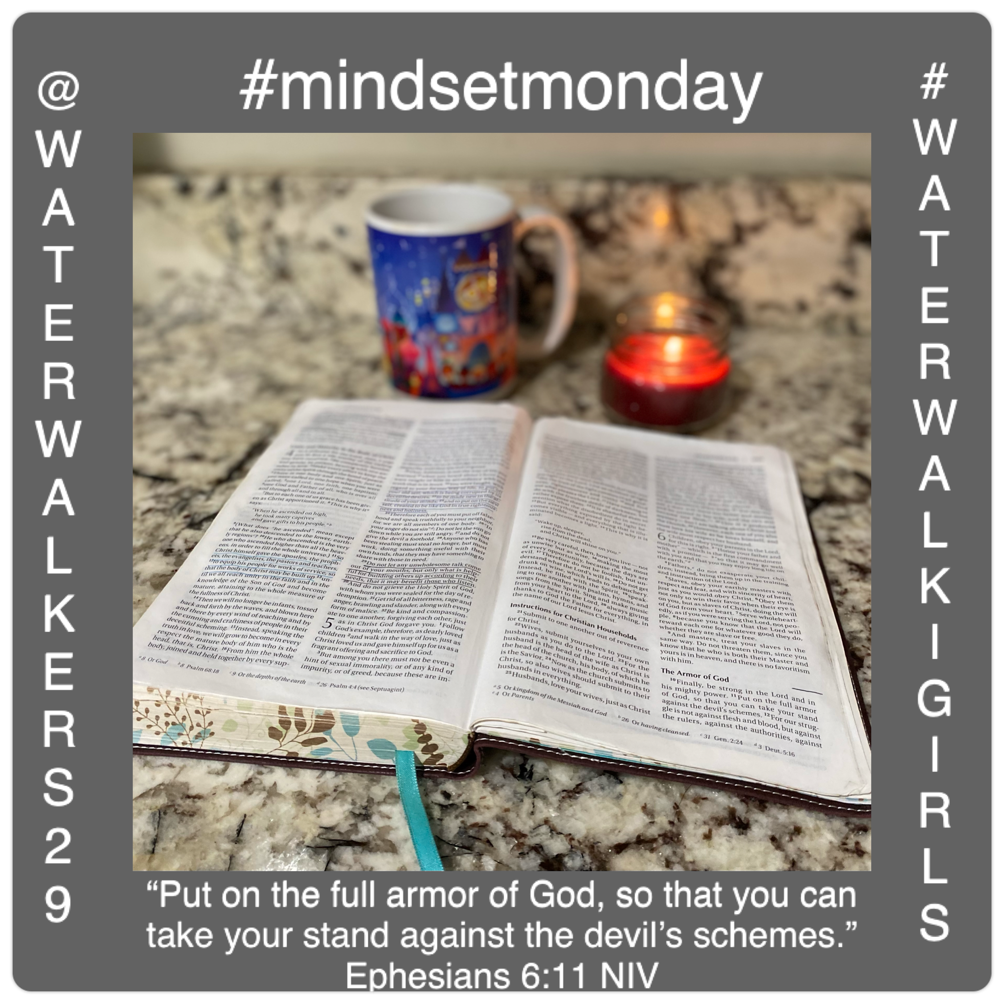 Today I am starting my day with Bible reading, prayer and devotion (and also coffee). My morning time with God is my favorite time of the day. During this time God gives me the strength, courage and insights I need to face the day ahead. It is also a time to guard my heart against the evil schemes of the devil. This Mindset Monday I encourage you to read the entire passage about the armor of God to prepare yourself for your day. Be bold in your prayers and ask God to surround you with all you will need today to “stand against the devil’s schemes.”