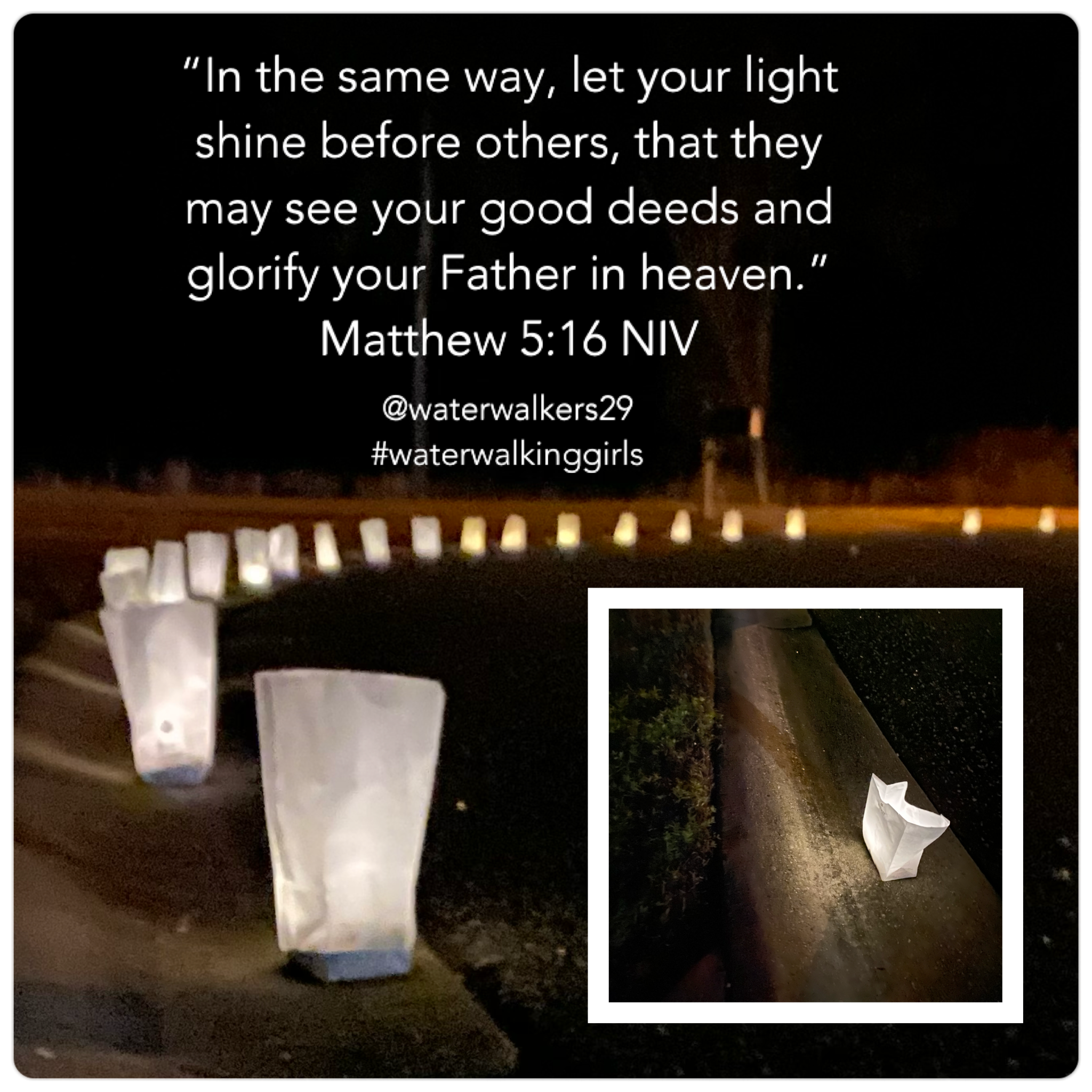 ““You are the salt of the earth. But if the salt loses its saltiness, how can it be made salty again? It is no longer good for anything, except to be thrown out and trampled underfoot. “You are the light of the world. A town built on a hill cannot be hidden. Neither do people light a lamp and put it under a bowl. Instead they put it on its stand, and it gives light to everyone in the house. In the same way, let your light shine before others, that they may see your good deeds and glorify your Father in heaven.”