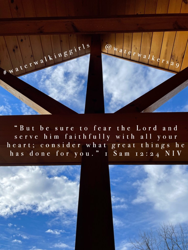 I took this picture while sitting on the porch of a cabin. I was noticing the great view in front of me and as I looked up I saw a cross. I was reminded of the great things the Lord has done for me. We read in 1 Sam 12:24; “But be sure to fear the Lord and serve him faithfully with all your heart; consider what great things he has done for you.”