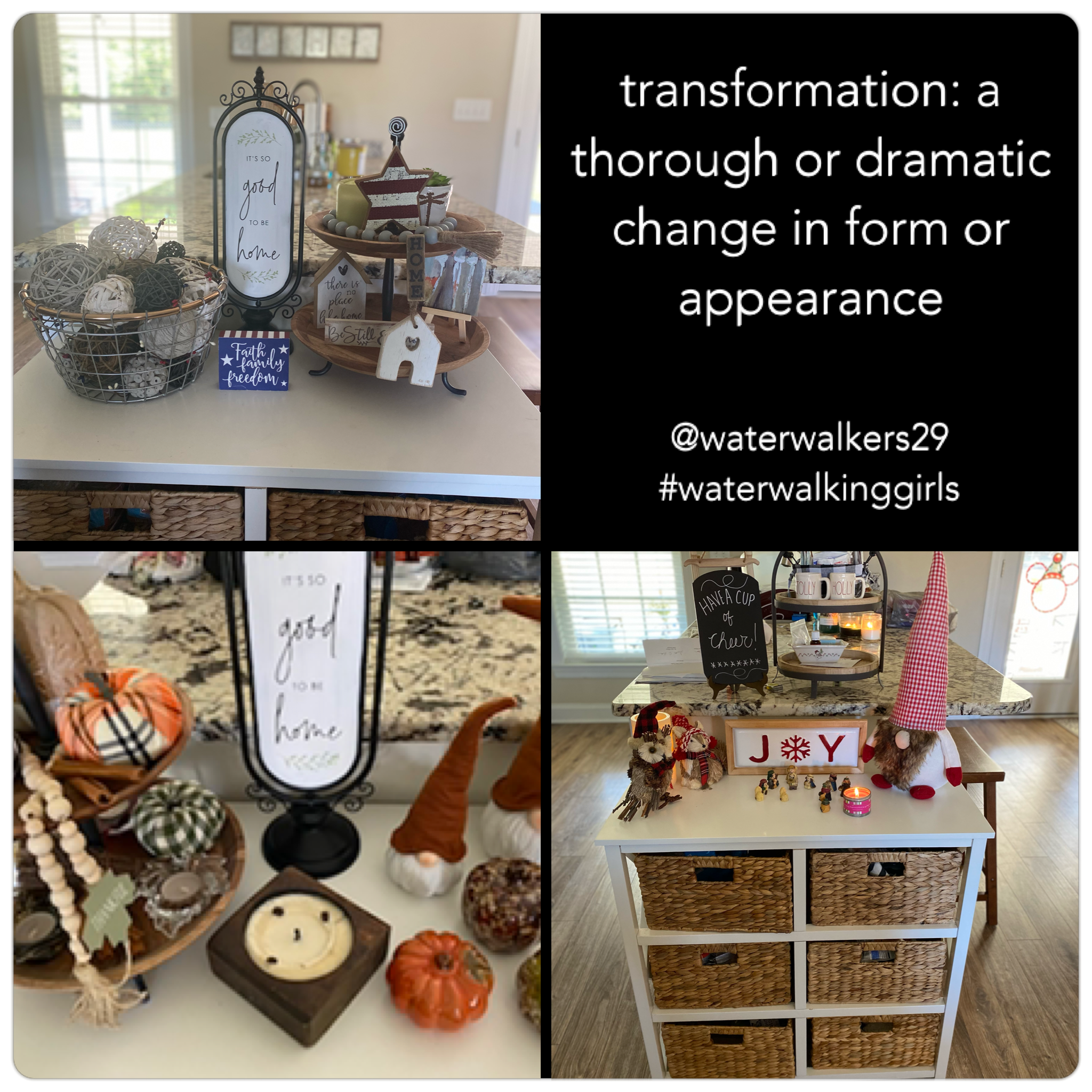 The pictures today are from a shelf in my kitchen that I transform each holiday. Decorating for the different seasons and changing out the decor is exciting and enjoyable to me. However, I can’t say I always approach transformation in myself with the same enthusiasm. How about you? Are you eager to change? Do you look forward to transforming?