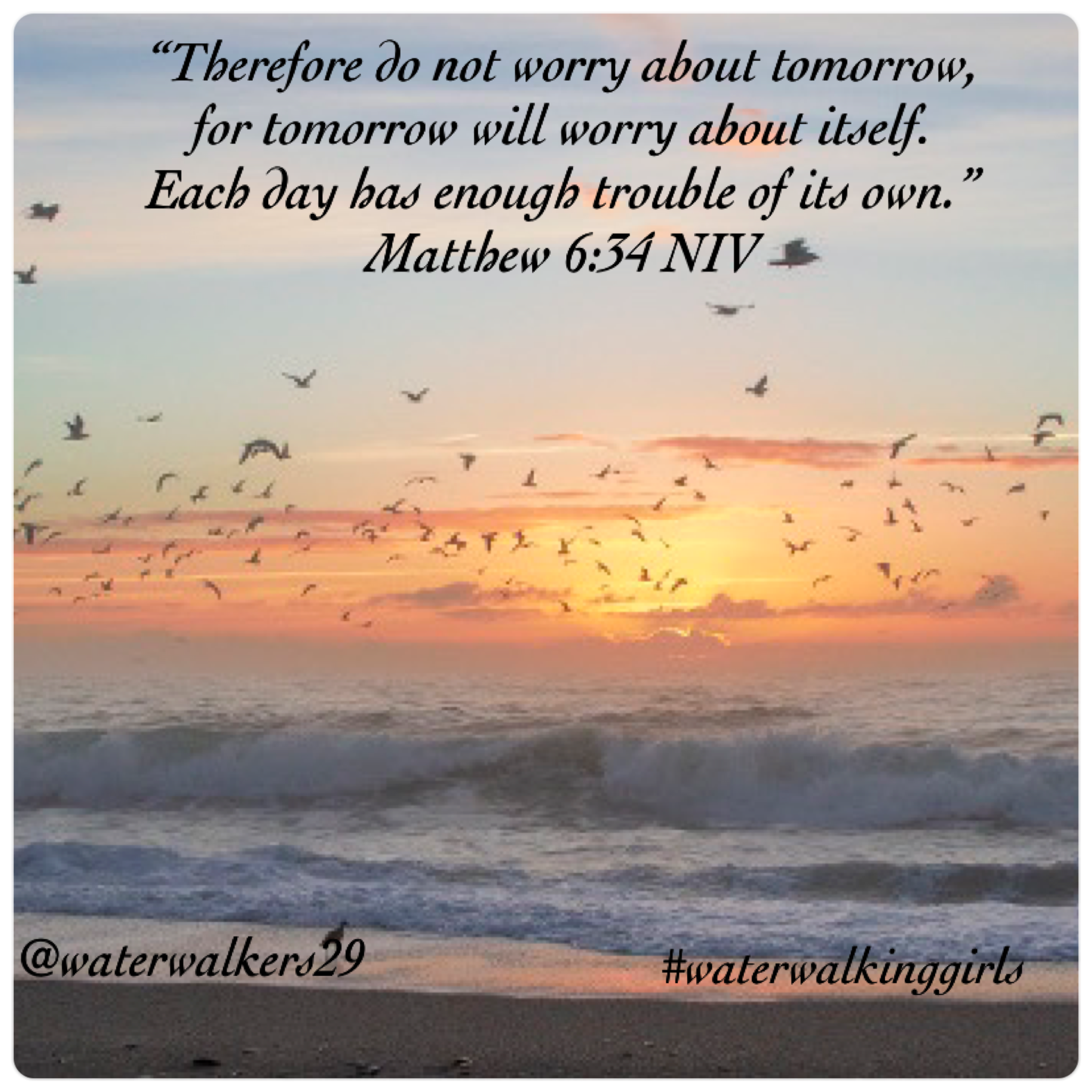 ““Therefore I tell you, do not worry about your life, what you will eat or drink; or about your body, what you will wear. Is not life more than food, and the body more than clothes? Look at the birds of the air; they do not sow or reap or store away in barns, and yet your heavenly Father feeds them. Are you not much more valuable than they? Can any one of you by worrying add a single hour to your life? “And why do you worry about clothes? See how the flowers of the field grow. They do not labor or spin. Yet I tell you that not even Solomon in all his splendor was dressed like one of these. If that is how God clothes the grass of the field, which is here today and tomorrow is thrown into the fire, will he not much more clothe you—you of little faith? So do not worry, saying, ‘What shall we eat?’ or ‘What shall we drink?’ or ‘What shall we wear?’ For the pagans run after all these things, and your heavenly Father knows that you need them. But seek first his kingdom and his righteousness, and all these things will be given to you as well. Therefore do not worry about tomorrow, for tomorrow will worry about itself. Each day has enough trouble of its own.” Matthew 6:25-34 NIV