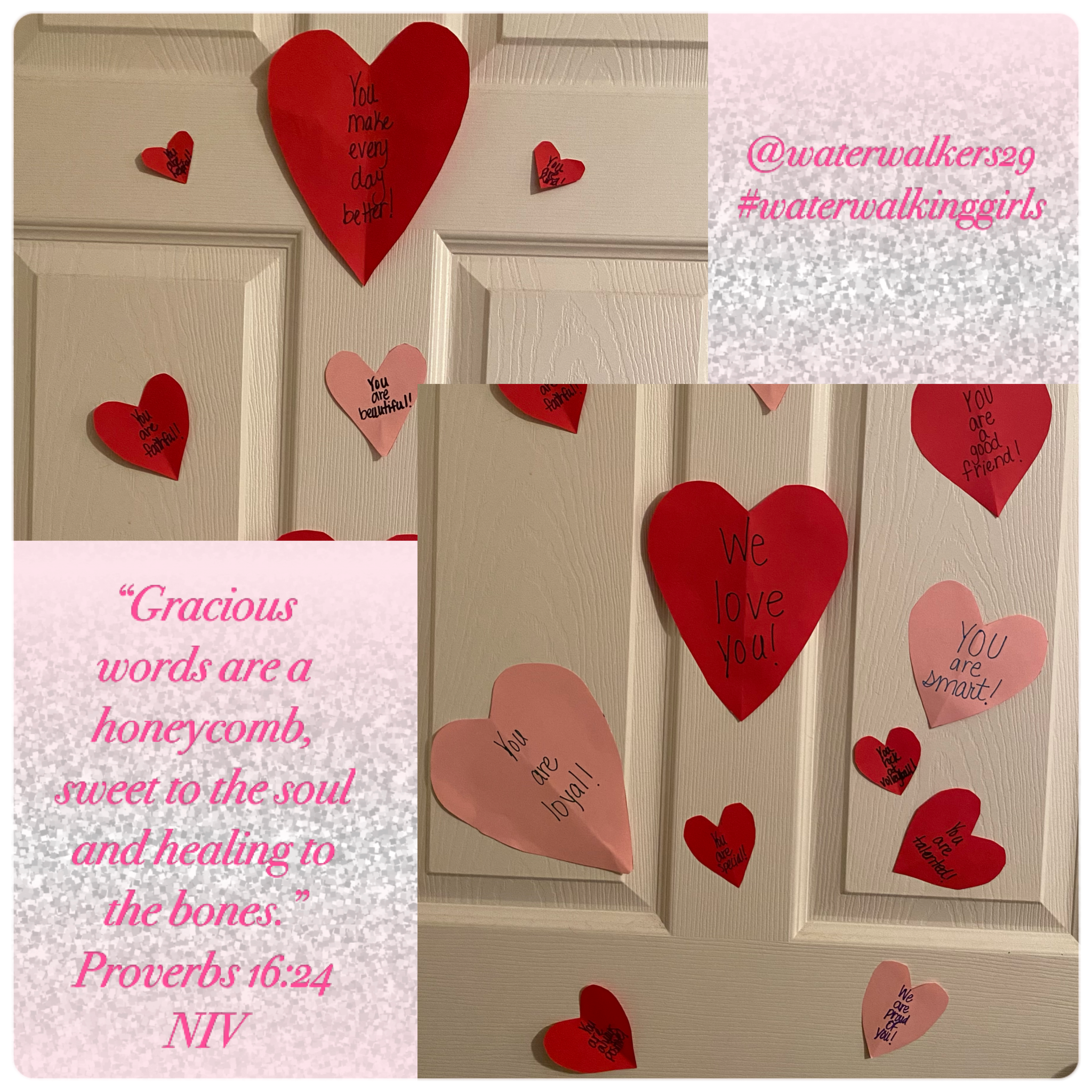For each day, February 1-14, I placed on the door inside my children’s bedroom, a heart with words of affirmation written on it. A few of the hearts had general affirmations but most were specific and unique to each child. Brainstorming the list and planning this project proved to have a positive affect on me too. I became acutely aware of the power of affirmations. Last night I was the recipient of positive affirmations and it made all the difference in my evening.