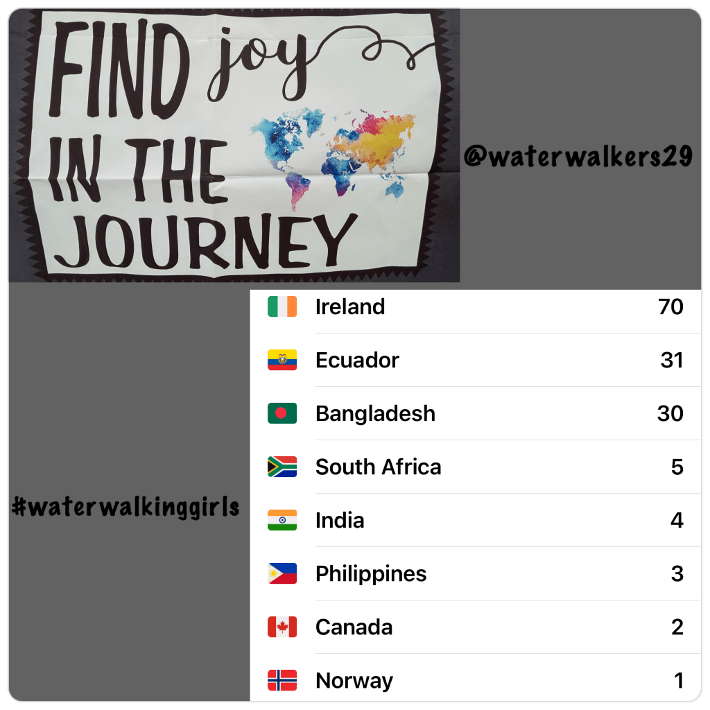 Let me start by explaining today’s picture. The map and my favorite hashtag; Find Joy in The Journey are from Herbert Memorial UMC’s VBS. The countries and numbers listed are just a few of last year’s Water Walking stats on who visited our blog from around the world. What do these two things have in common? Both are serving in missions from the small hometown of Georgetown South Carolina. How is this possible? Every year at VBS there is a missions project. This year’s mission is collecting for the Amazing Grace Academy in Liberia. As I sat with the children at VBS, the pictured map got my attention. There is a similar map within our blog stats for Deborah and I to have a visual of the different countries.
