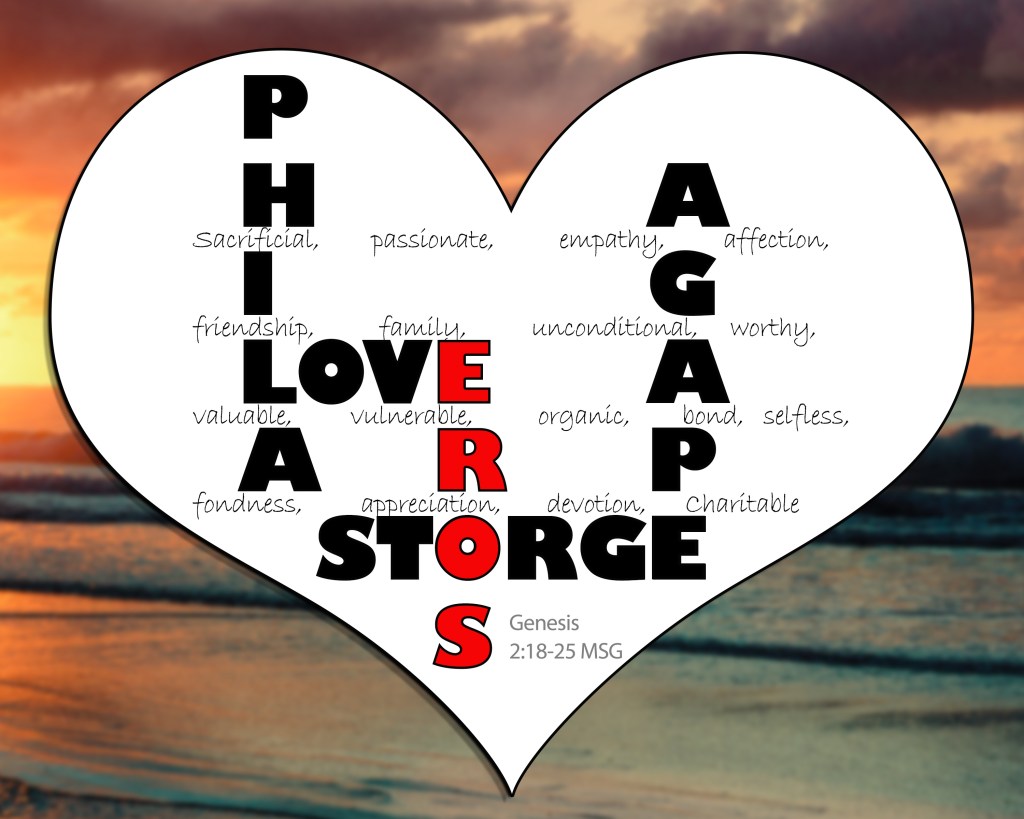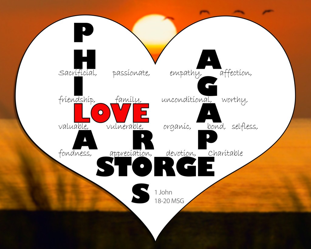 This week we are talking about the different types of love because my word for 2023 is “love”. Today I am highlighting Storge love. If you look at some of the background words in this photo you will see, family, selfless, and affection. According to Wikipedia, storge love is a natural and instinctual affection. Whether you are a child, parent, aunt, uncle, grandparent, or godparent you know of this love. When it comes to our children, we would give up our lives for them.