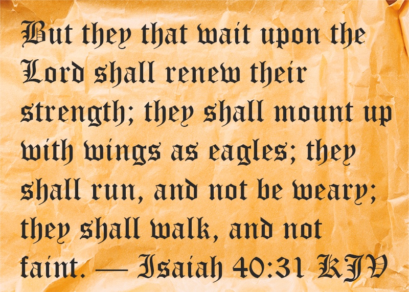 Isaiah 40:31 KJV — But they that wait upon the Lord shall renew their strength; they shall mount up with wings as eagles; they shall run, and not be weary; they shall walk, and not faint.